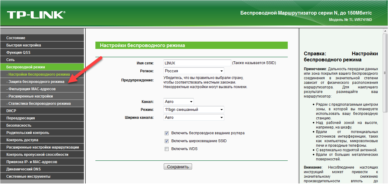 Если и название сети нужно узнать, переходим в подраздел «Настройка беспроводного режима». Здесь, в поле «Имя сети», находится её название, тут же оно и изменяется.