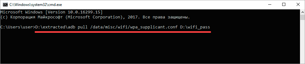 5. Откройте командную строку от имени администратора. Напечатайте команду: D:\extracted\adb pull /data/misc/wifi/wpa_supplicant.conf D:\Password