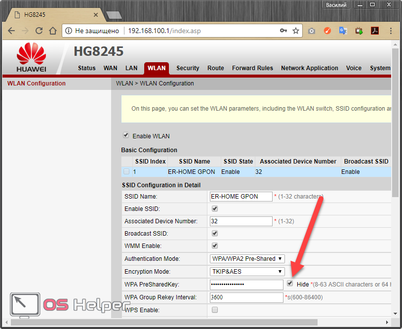 - В этом разделе напротив строки «WPA PreSharedKey» будет стоять галочка, около которой написано «Hide». Для того чтобы увидеть пароль, её нужно убрать.