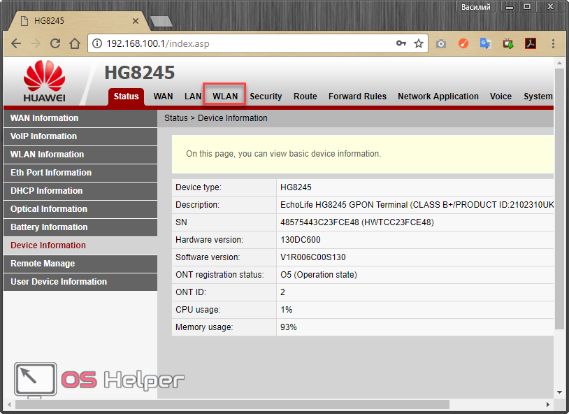 - В случае успешного входа перейдите на вкладку «WLAN».