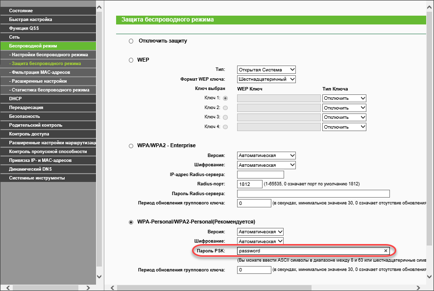 - Там же ищем строку с нужным значением, например, для «WPA/WPA2» это «Пароль PSK».