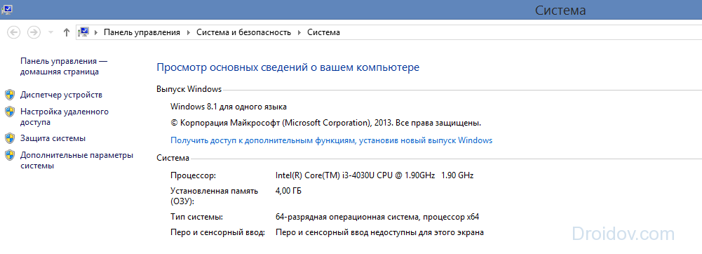 Здесь визуализируется вся необходимая пользователю информация о версии, выпуске и разрядности используемой системы. Также здесь отображаются данные об используемом процессоре и объеме ОЗУ.
