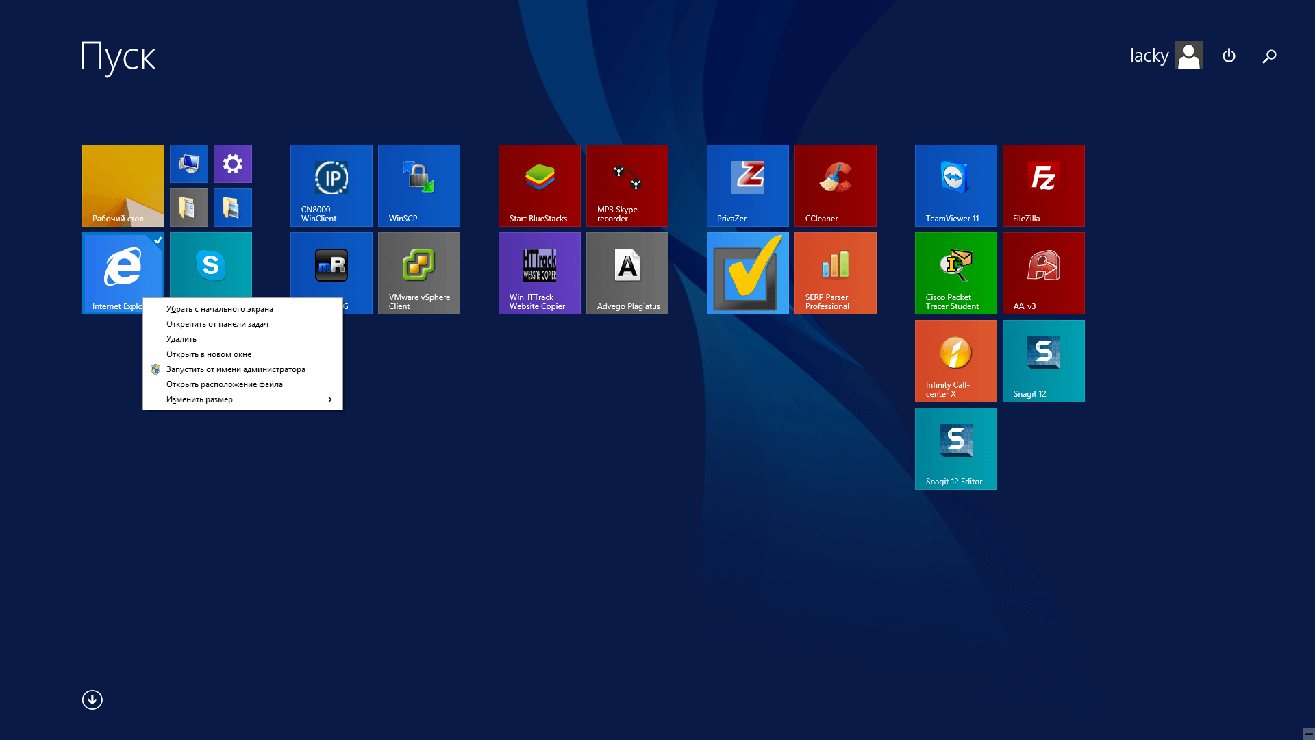 Если вы щелкните правым кликом по любой из плиток, то вызовете контекстное меню, в котором сможете ее удалить или запустить от имени администратора.