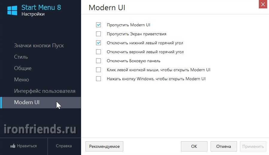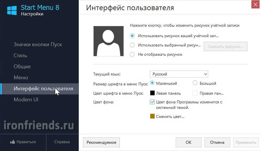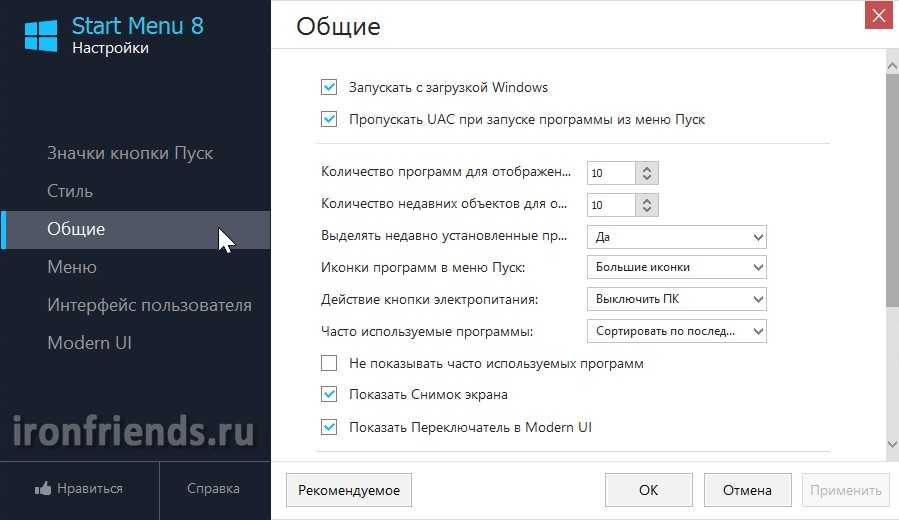 Настройки программы позволяют задать значок кнопки ПУСК, немного изменить стиль оформления и прозрачность фона, цвет и размер шрифтов, включить или отключить те или иные пункты меню. Также поддерживается загрузка сразу на рабочий стол и отключение активных углов Windows 8.1.