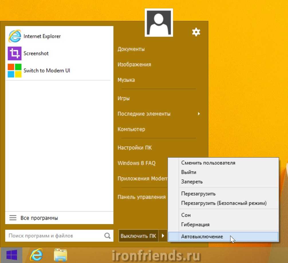 Под кнопкой управления питанием, кроме привычных действий, есть пункт «Автовыключение».