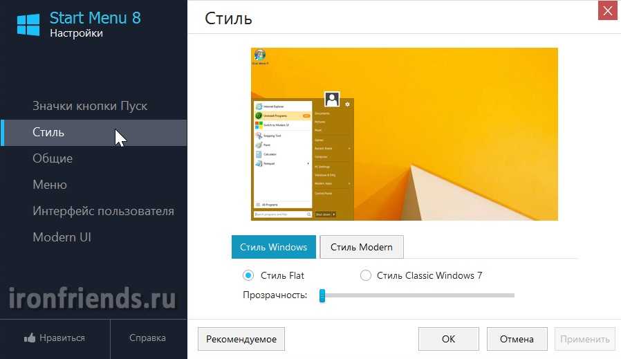 В настройках программы Start Menu 8 мы можем выбрать стиль меню Пуск,