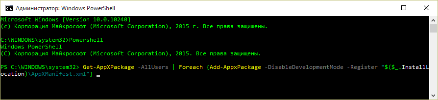 - Откройте командную строку (от администратора) и выполните инструкцию: Powershell — это запустит одноименное консольное приложение. После появления приглашения ввода PS C:\WINDOWS\SYSTEM32 выполните еще одну команду:C:\WINDOWS\SYSTEM32″ вставляем и выполняем: Get-AppXPackage -AllUsers | Foreach {Add-AppxPackage -DisableDevelopmentMode -Register “$($_.InstallLocation)\AppXManifest.xml”}