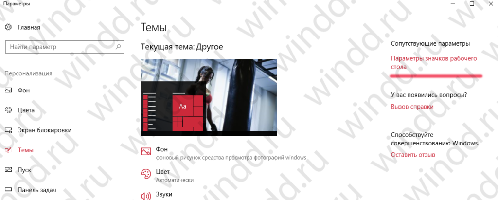 Пользователю достаточно перейти в раздел: Пуск > Параметры > Персонализация > Темы, а затем в сопутствующих параметрах выберите Параметры значков рабочего стола.