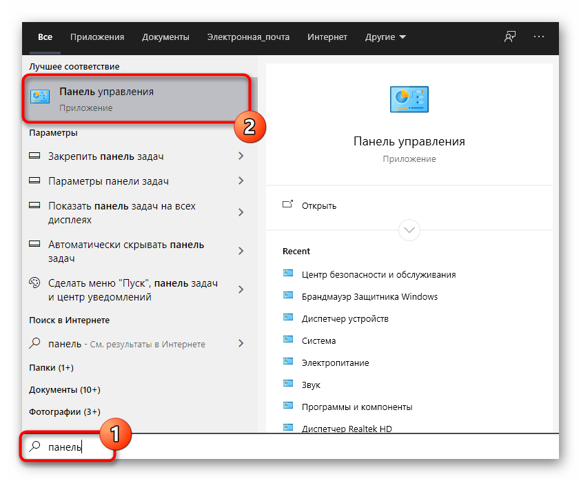 - Откройте меню Пуск и через поиск отыщите приложение «Панель управления».