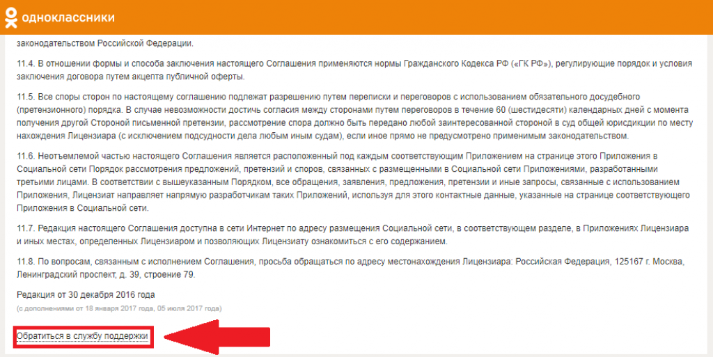 Рис. 2 Ссылка «Написать в службу поддержки» Одноклассников