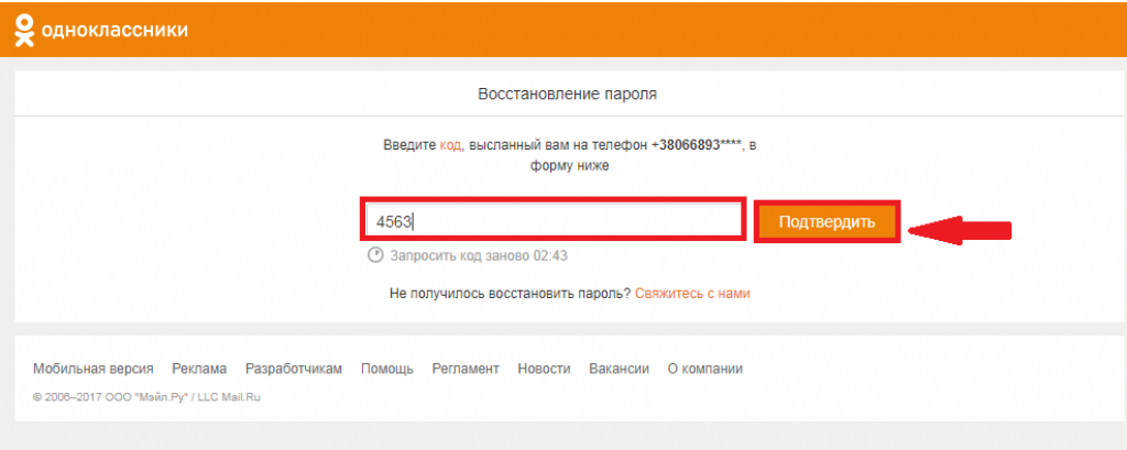 В первое поле вводится номер телефона, который был указан при регистрации — это важно! В противном случае, анкету восстановить не удастся. За довольно короткий срок на телефон приходит заветная смс-ка с кодом, который вводится на странице с соответствующим полем