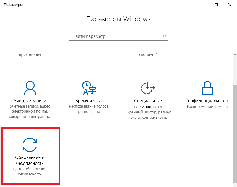 - Нажмите “Пуск” — “Параметры” и откройте раздел “Обновление и безопасность”;