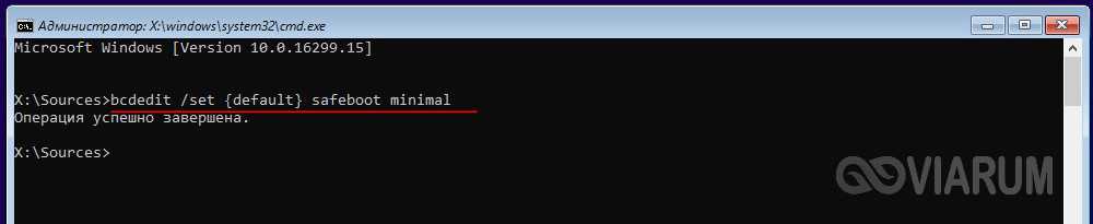 - вторая — bcdedit /set {GUID} safeboot minimal, где вместо “GUID” укажите появившееся значение