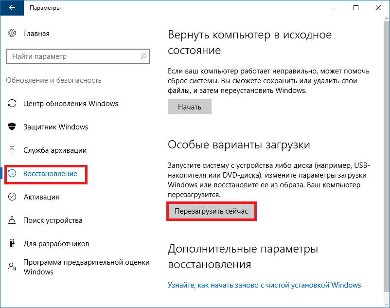 - Откройте строку “Восстановление” и нажмите на кнопку “Перезагрузить сейчас”;