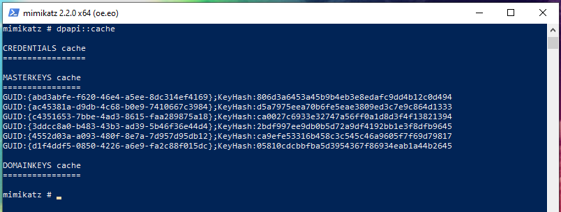 Для удобства, mimikatz хранит кэш извлечённых мастер ключей. Причём не просто хранит и показывает их, но и использует нужный мастер ключ в том случае, если он нужен для определённых операций. Чтобы посмотреть содержимое кэша выполните команду: