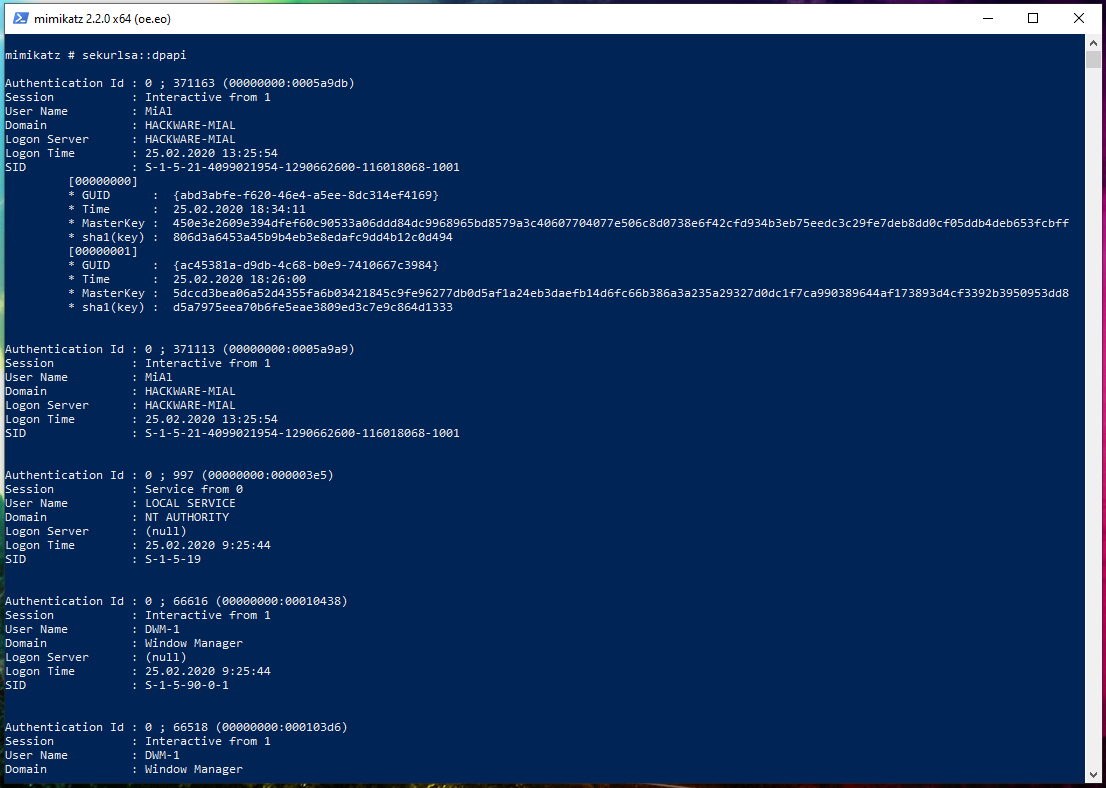 В mimikatz есть функция, которая извлекает все мастер ключи для текущего пользователя. Но прежде чем перейти к ней, давайте «пощупаем» сами мастер ключи, чтобы они не были для нас чем-то абстрактными.