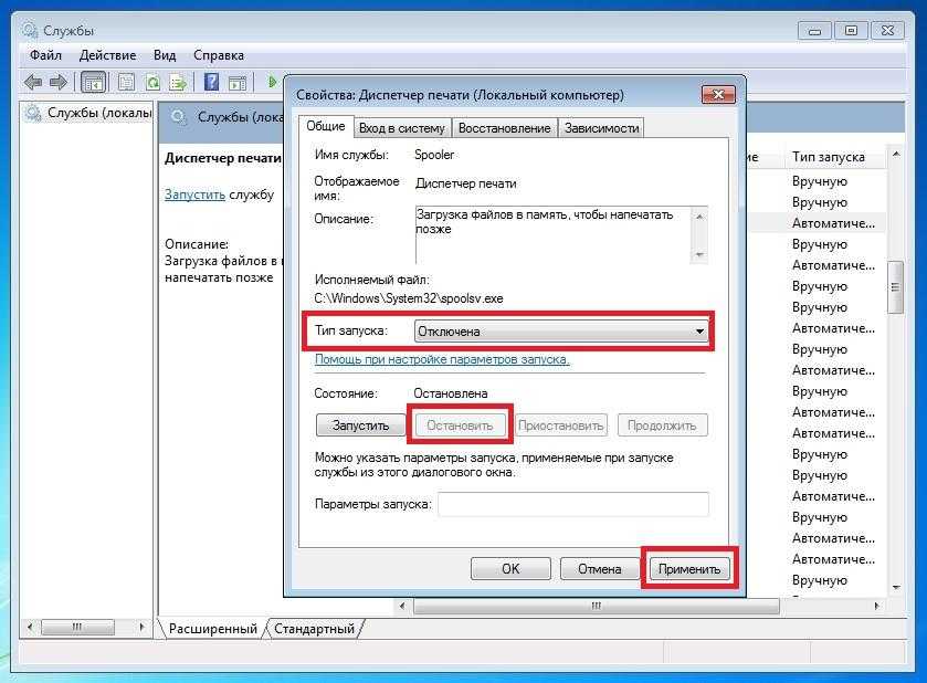 Чтобы полностью остановить «Диспетчер печати», выберем тип запуска «Отключена» и нажмем кнопку Остановить. После этих действий служба перейдет в состояние «Остановлена».
