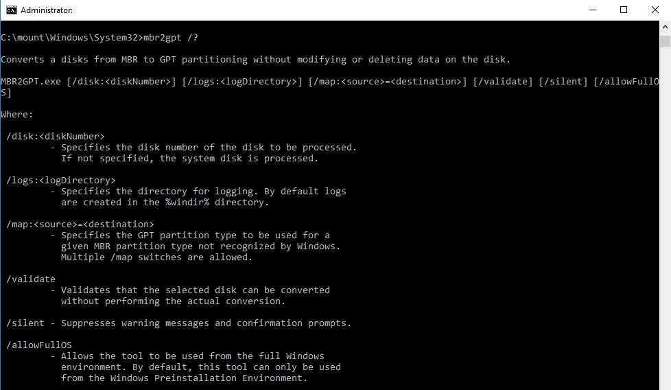 Программа «MBR2GPT.EXE» позволяет изменить стиль разметки жесткого диска из «Основная загрузочная запись» или MBR на стиль «Таблица разделов GPT» или GPT. При этом все выполняемые изменения происходят без повреждения или удаления данных на жестком диске. Программа может быть запущена в командной строке при установке Windows (в Windows PE), в среде восстановления Windows, а также в полноценной рабочей версии Windows 10 (с использованием параметра /allowFullOS). Программа MBR2GPT располагается в папке Windows\System32 на системном разделе Windows 10 и доступна начиная с версии 1703 (Creators Update) или более поздней.