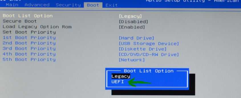 Шаг 3. Теперь необходимо изменить свою прошивку (bios) для загрузки в режим UEFI. После перезагрузки системы, войдите в параметры UEFI (он же БИОС) и измените тип загрузки на режим UEFI. Так как разновидностей БИОС и UEFI очень много, вам придется посмотреть в google картинках, как изменить режим загрузки UEFI. Теперь вы преобразовали свой старый MBR-диск в GPT-диск.