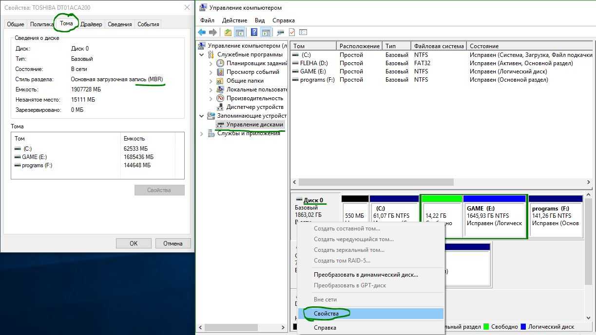 Шаг 1. Сначала узнайте номер вашего конвертируемого диска и его текущий раздел таблицы. Для этого наберите в поиске пуска «Управление компьютером» и выберите нажав по нему. В появившимся окне перейдите к разделу «Управление дисками» и запомните номер жесткого диска, в моем случае (Диск 0), который хотите преобразовать. Далее нажмите на этом диске правой кнопкой мыши и выберите свойства. В новом окне перейдите во вкладку Тома и проверьте текущий стиль разделов.