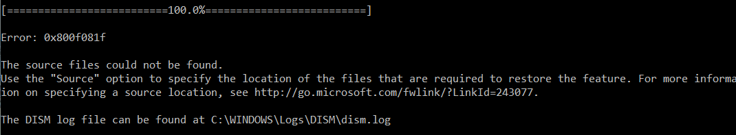 - Ошибка: 0x800F081F. Не удалось найти исходные файлы. Укажите расположение файлов, необходимых для восстановления компонента, с помощью параметра Источник (Error 0x800f081f, The source files could not be found. Use the «Source» option to specify the location of the files that are required to restore the feature).