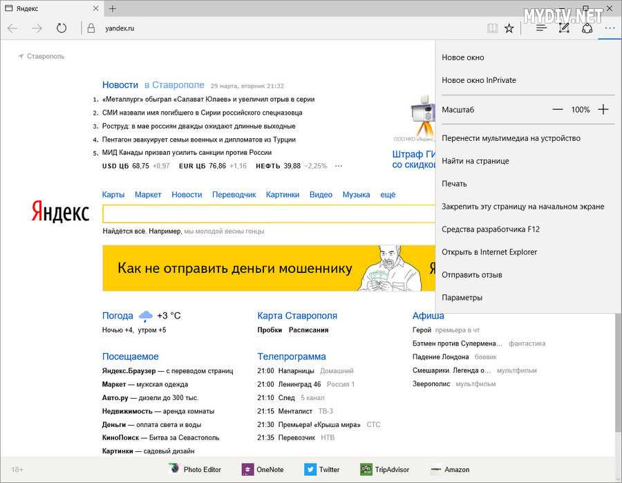 Интерфейс браузера Microsoft Edge