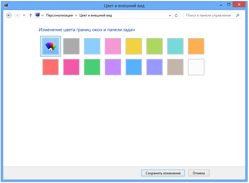 Затем, внизу окна кликните по иконке Цвет. В результате вы увидите панель управления цветом и внешним видом, которая немного проще, чем была в Windows 7. При этом в ней есть новая опция — Автоматический цвет (первая в списке выбора из 16 цветов границ окон).