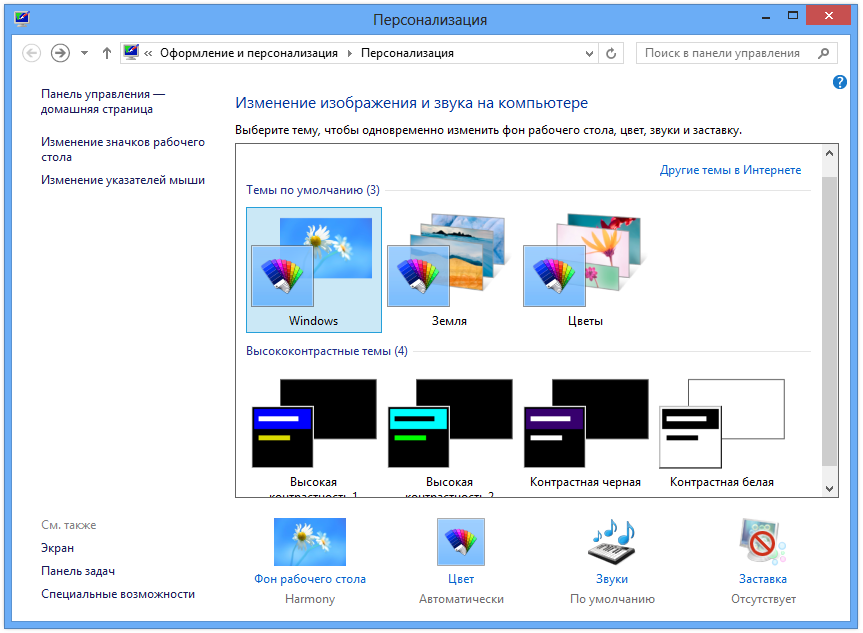 Изначально в Windows 8/8.1 предустановлено четыре базовых высококонтрастных темы. Но гибкие настройки высококонтрастных тем позволяют настроить интерфейс системы под индивидуальные предпочтения пользователей.