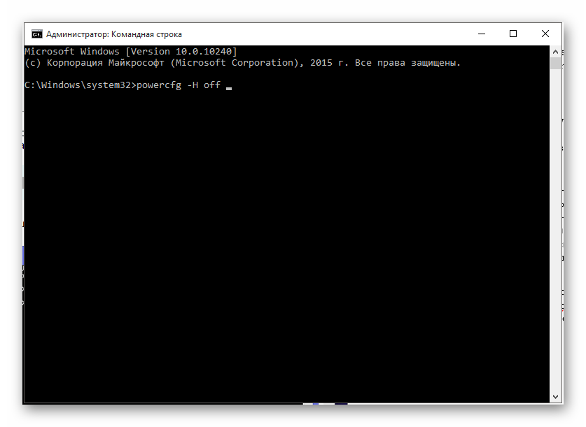 В открывшейся консоли введите команду powercfg –H off и выполните ее, нажав на клавишу Энтер;