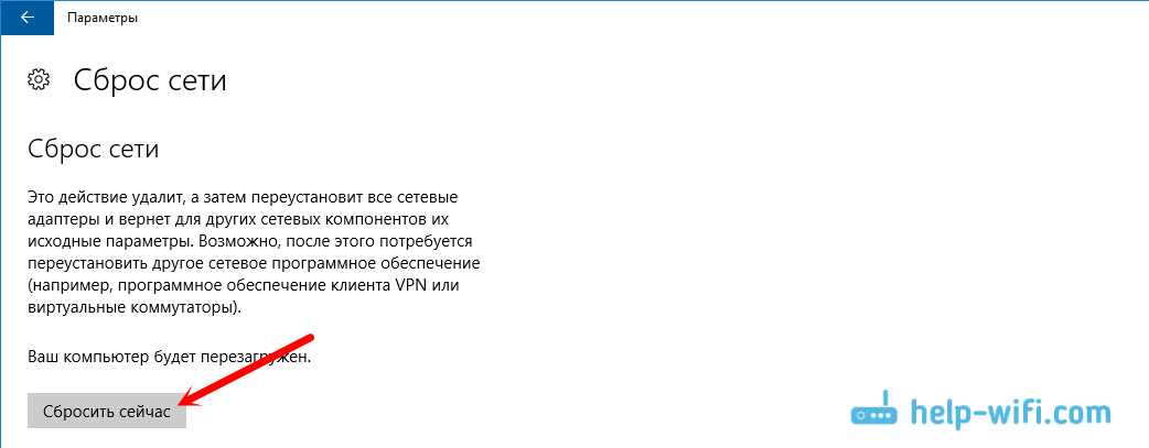 Дальше откроется предупреждение, что сброс удалит все сетевые настройки, адаптеры и подключения. Нужно со всем согласиться и нажать на «Сбросить сейчас». Произойдет перезагрузка компьютера.