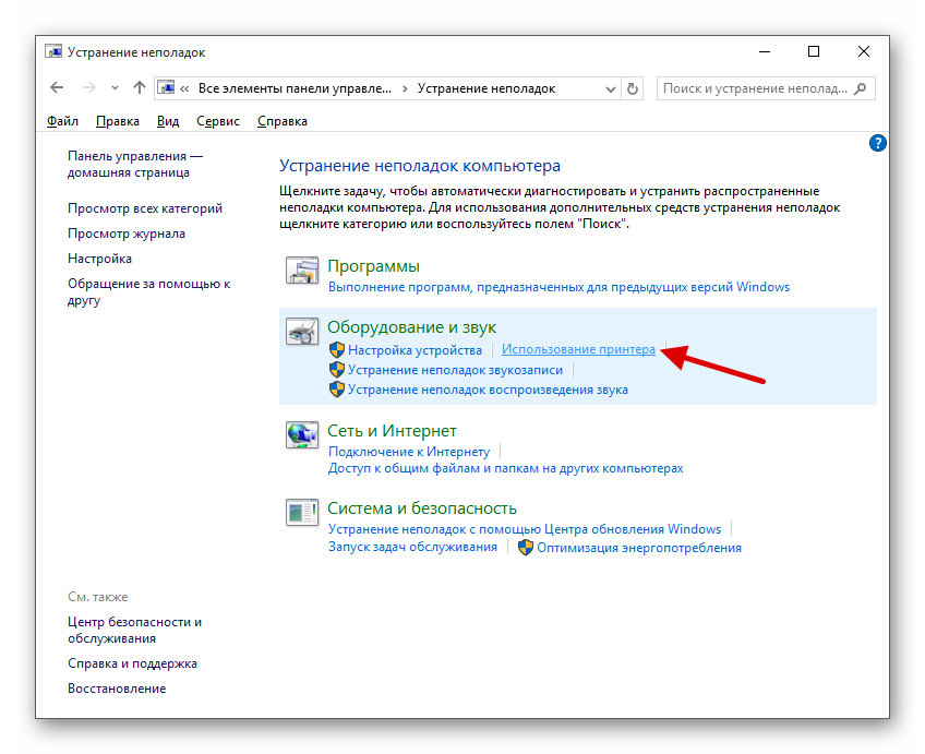 Для запуска из панели управления, зайдите в нее, затем откройте пункт «Устранение неполадок», затем в разделе «Оборудование и звук» выберите пункт «Использование принтера» (еще один путь — «зайти в устройства и принтеры», а затем, кликнув по нужному принтеру, если он есть в списке, выбрать «Устранение неполадок»). Также для запуска инструмента устранения неполадок принтера можно скачать файл с официального сайта Microsoft здесь.