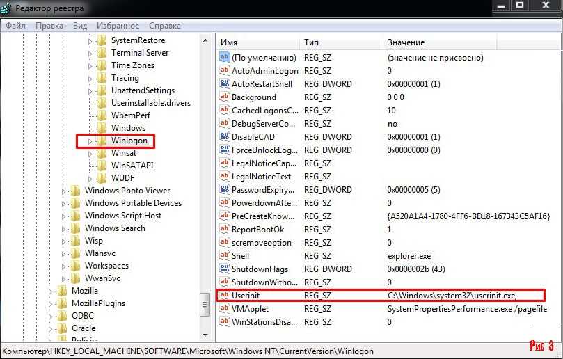 В параметрах этой строки должно быть прописано так: «C:\Windows\system32\userinit.exe», если у вас другое значение — значит, вирус изменил параметры данной строки, и вам нужно обратно поменять их на правильные параметры.