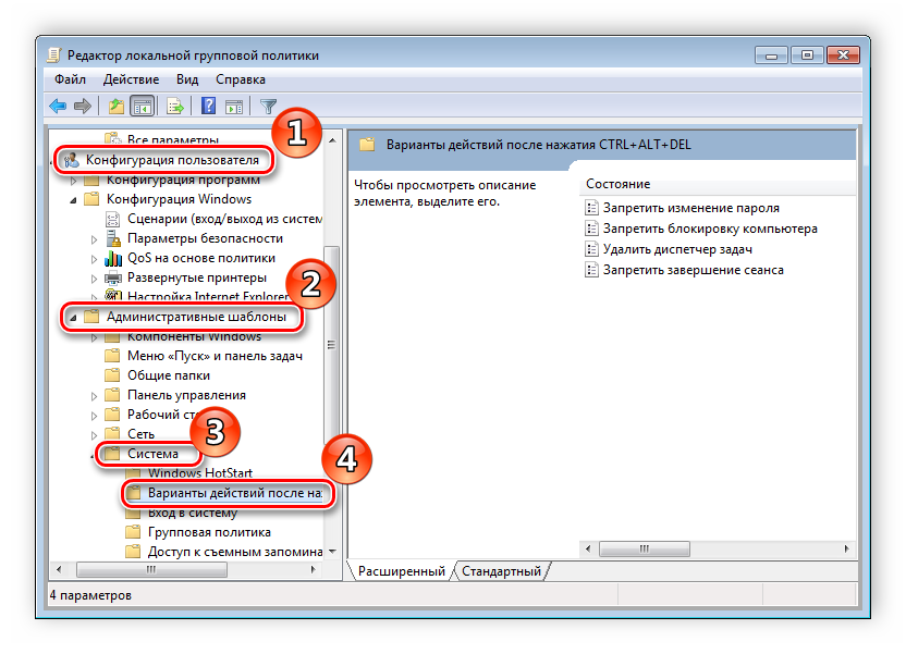 - Перейдите в папку «Конфигурация пользователя», «Административные шаблоны», «Система» и «Варианты действий после нажатия Ctrl + Alt + Delete».