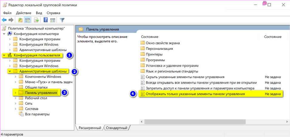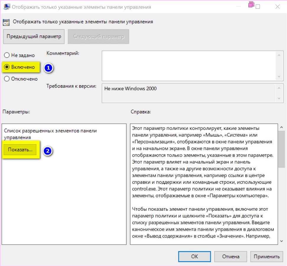 - Дважды щелкнуть ЛКМ по параметру политики Отображать только указанные объекты панели управления.