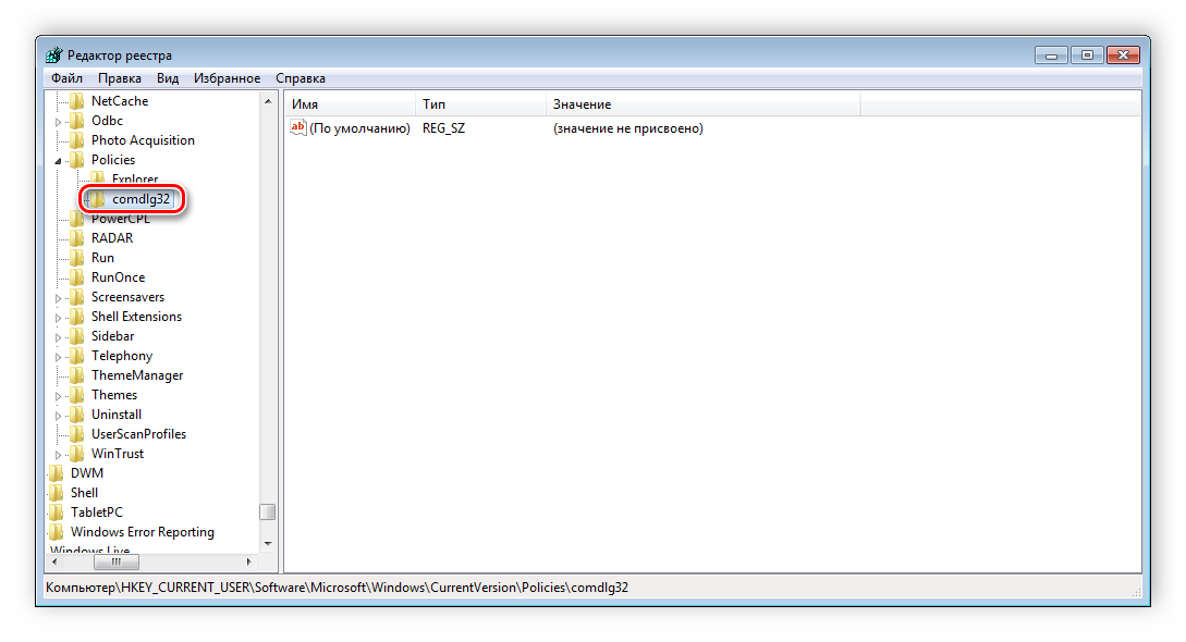 Выберите папку «Policies» и сделайте в ней раздел comdlg32.