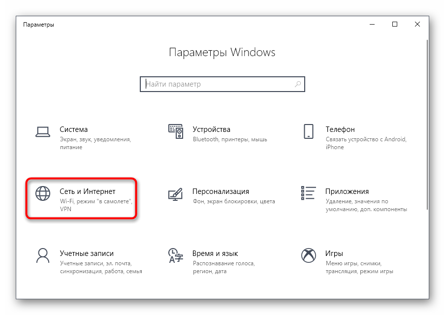 - В том же меню «Параметры» зайдите в раздел «Сеть и Интернет».