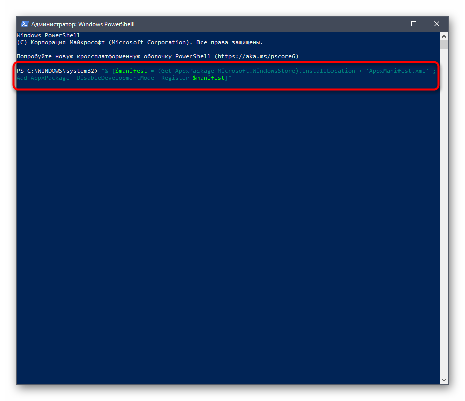 - В открывшемся окне выполните команду: Get-AppXPackage -AllUsers | Foreach {Add-AppxPackage -DisableDevelopmentMode -Register “$($_.InstallLocation)\AppXManifest.xml”}