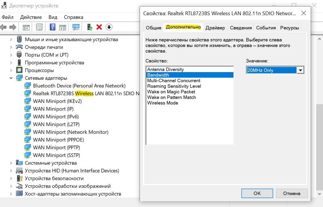 Настройки региона вашего адаптера Wi-Fi должны соответствовать настройкам вашего маршрутизатора Wi-Fi, иначе ваш ноутбук не сможет найти беспроводную сеть. Также, можно изменить параметры частоты. Нажмите Win+R и введите devmgmt.msc,чтобы открыть снова диспетчер устройств. Разверните список сетевых адаптеров и нажвите два раза по беспроводному. Далее перейдите во вкладку «Дополнительно», и начнем. Если у вас есть Bandwidth, то попробуйте установить значение 20 MHz Only. Если у вас нет его, а есть 802.11n channel width for 2.4GHz, то поменяйте его на 20 MHz Only.