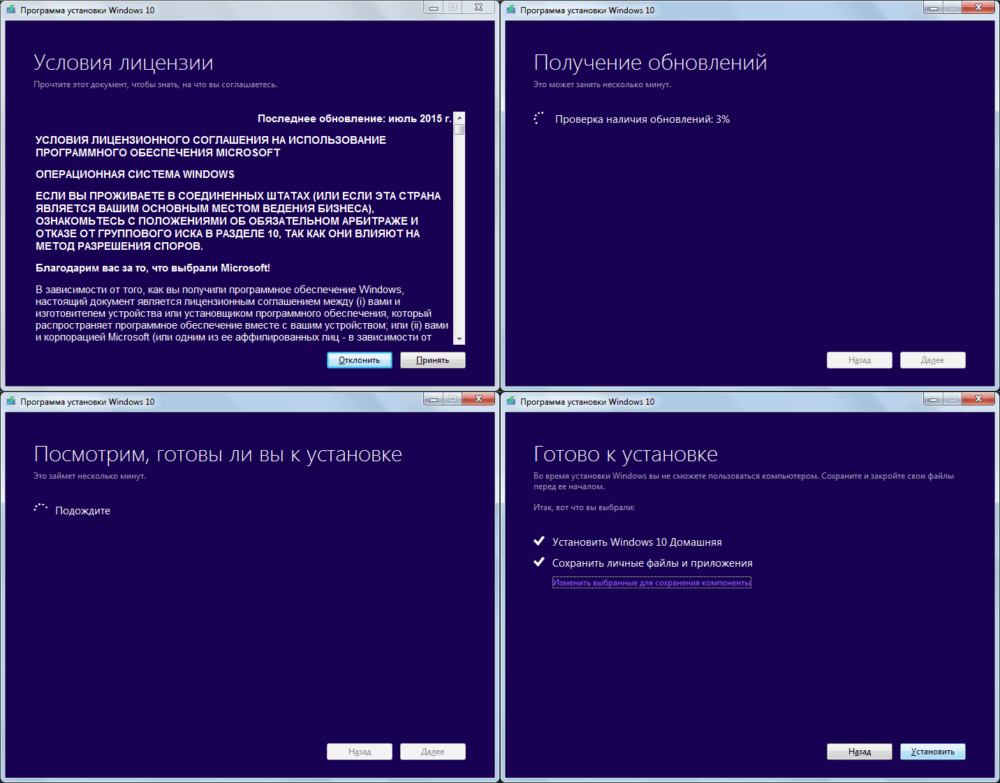 После принятия вами условий лицензии Windows 10, программа установки проверит наличие обновлений (достаточно продолжительный процесс) и предложит установить обновление Windows 10 с сохранением личных файлов и приложений (при желании, можно изменить список сохраняемых компонентов). Нажмите кнопку «Установить».