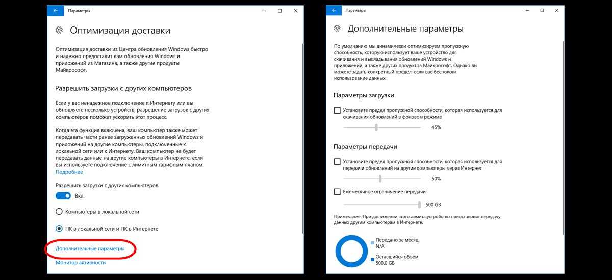 Включение этого параметра в настройках может ускорить получение самых последних обновлений для Windows 10. Это происходит за счёт того, что скачивание файлов будет производиться не только с серверов Microsoft, но и с компьютеров обычных пользователей (именно по такому принципу работают торренты). Ваш компьютер в этом случае также будет раздавать части уже загруженных обновлений другим пользователям в интернете. При лимитном подключении к интернету такая передача будет остановлена. Если далее в этом пункте параметров нажать на ещё одну ссылку «Дополнительные параметры», то можно самостоятельно ограничить скорость закачки от других пользователей Windows 10 в интернете, а также отдачу им своих обновлений.