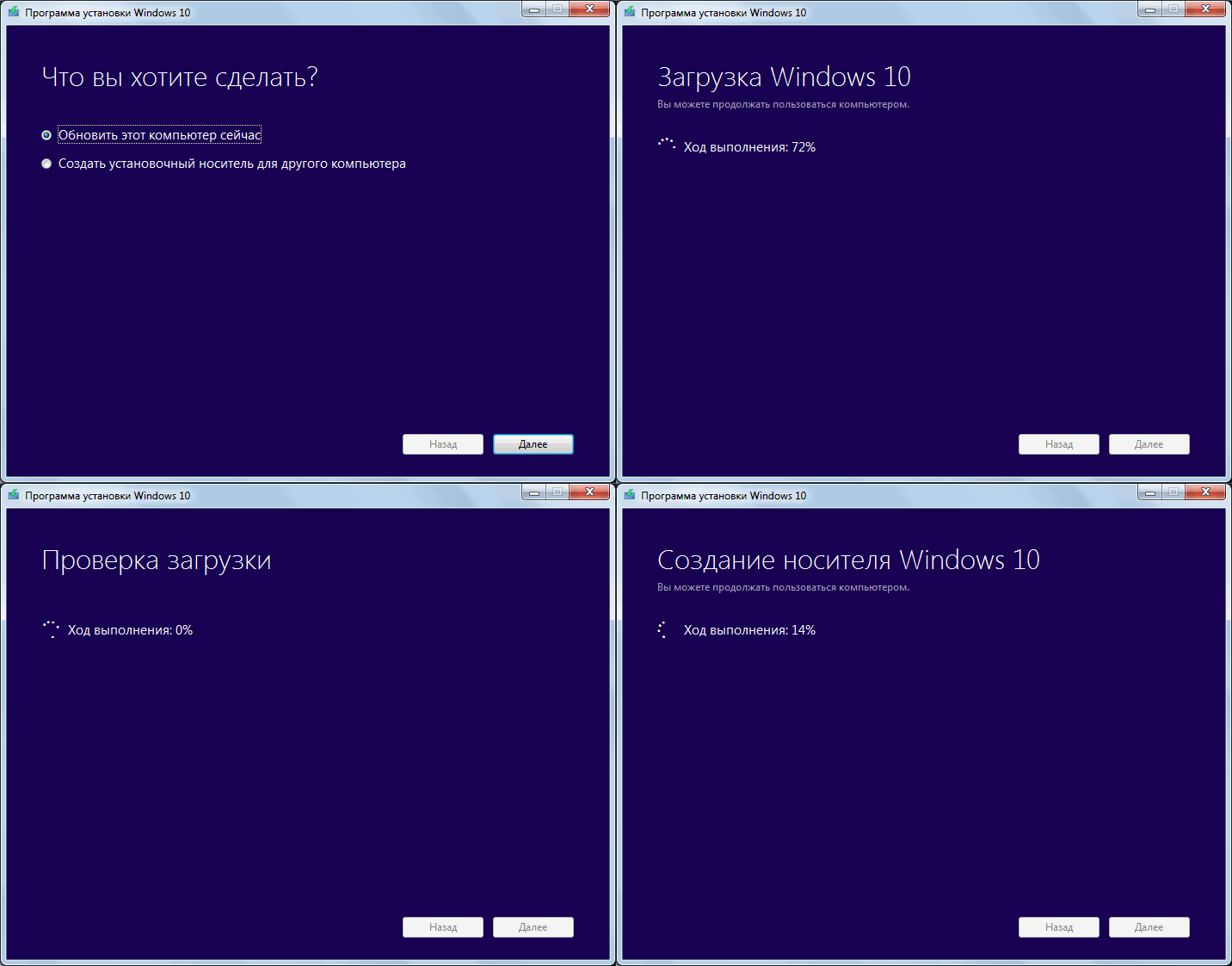 После выбора «Обновить компьютер сейчас», начнется автоматическая загрузка файлов Windows 10 на компьютер, по завершении которой произойдет «Проверка загруженных файлов» и «Создание носителя Windows 10» (какой-то отдельный накопитель не нужен, это происходит на вашем жестком диске). По завершении, автоматически запустится процесс установки Windows 10 на компьютер (такой же, как и при использовании способа с резервированием).