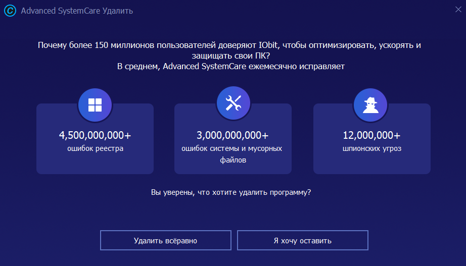 Возможно, для завершения деинсталяции Advanced SystemCare необходимо будет произвести перезагрузку Вашего компьютера. Все соответствующие сервисы программы будут удалены. И она больше не будет запускаться.