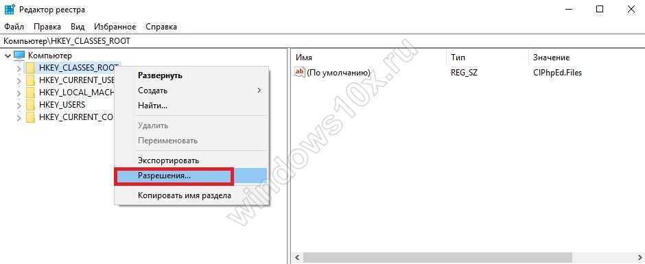 На первой команде HKEY_CLASSES_ROOT кликаем пкм и выбираем «Разрешения…».