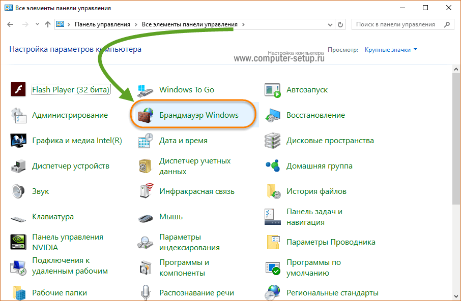 Подсказка: Чтобы увидеть ярлык «Брандмауэр Windows» в Панели управления, выберите крупные значки в правом верхнем углу.