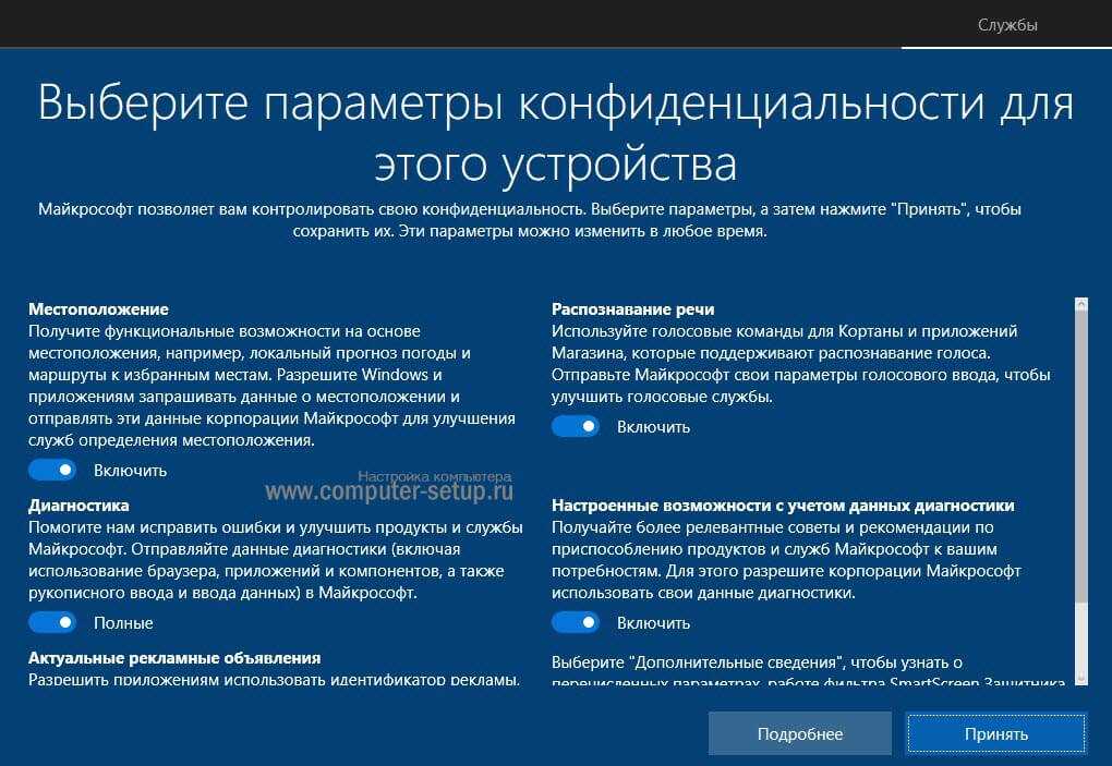 5Подождите еще некоторое время, пока система обновляется. После этого появится окно настроек. В нем можно включить или выключить такие параметры, как местоположение, диагностика, распознавание речи и так далее. Установите их по желанию и нажмите «Принять».