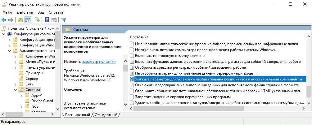 2. Далее перейдите Конфигурация компьютера > Административные шаблоны > Система. С правой стороны прокрутите немного вниз и найдите «Укажите параметры для установки необязательных компонентов и восстановления компонентов.»