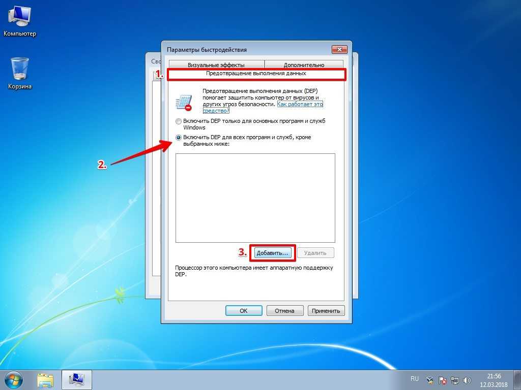 В «Параметры быстродействия» нажмите на «Предотвращение выполнения данных», а затем нажмите на «Включить DEP для всех программ и служб, кроме выбранных ниже» и нажмите «Добавить».