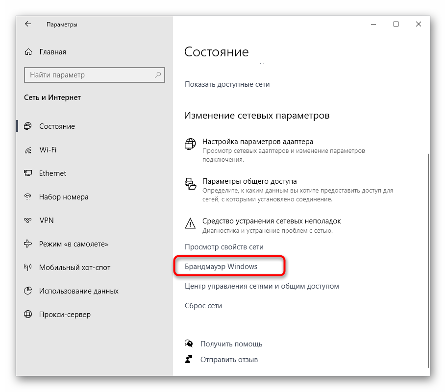 В первом же меню «Состояние» опуститесь вниз и нажмите по кликабельной надписи «Брандмауэр Windows».
