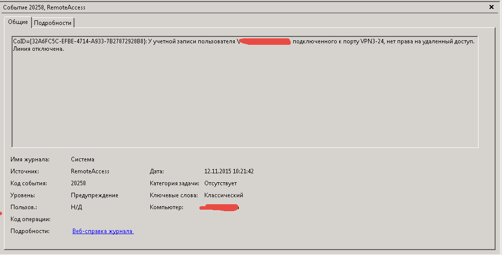CoID={32A6FC5C-EFBE-4714-A933-7B27872928B8}: У учетной записи пользователя \имя юзера, подключенного к порту VPN3-24, нет права на удаленный доступ. Линия отключена.